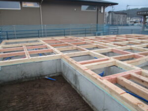 ◇基礎工事~完了した全景⇒建物周囲への配管施工⇒土台敷きの工程(大工の工程)へ