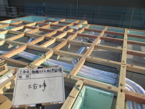 ◇24時間換気システム(全熱交換型)本体・換気ダクトを、この段階で床下へ設置します
