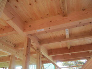 ◇木工事の様子~建物の外周は構造用面材で覆う形で施工します。筋交いと呼ばれる斜め材のみと比較して、面で支える構造となるので、地震などの揺れに対して、踏ん張りの効く強い構造となります。