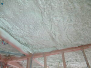 ◇内部~吹付断熱施工「アクアフォーム」。隙間の無い断熱施工で省エネ性UP。熊本の夏の暑さ・冬の寒さを軽減します。一般的な断熱方法と異なり、特に夏場の暑さに影響を与える、小屋浦(屋根の直ぐ下部)部分で断熱を行うので、暑さを大幅に軽減します。