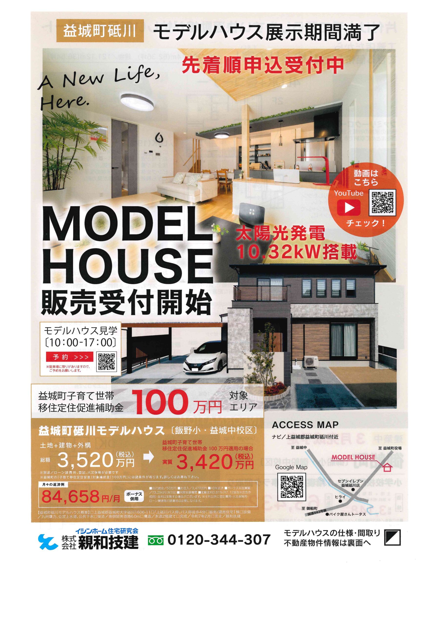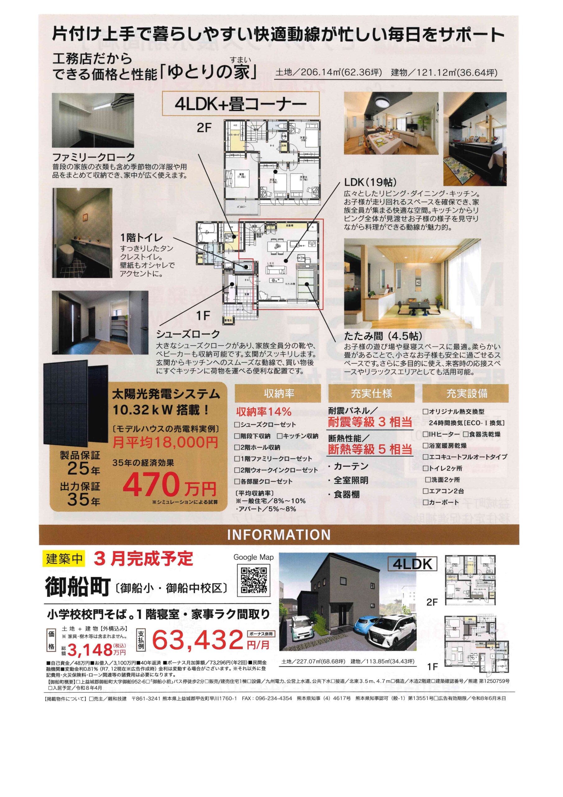 「益城町砥川モデル展示期間満了」に付き、販売受付を開始。建物は4LDK+4帖の畳コーナー付(延床)36.64坪。カーテン+照明+エアコン(2台)+太陽光 10.32kw搭載+2台用カーポートが付いていますので、即ご入居出来ます。駐車スペースは計4台分確保。雨の日も、玄関からカーポートへ直接行くことが出来るので、濡れずに出入りが可能です。建物は「耐震等級3相当」「断熱等級5相当」。収納率も一般住宅と比べ高く、14%を確保。室内の整理整頓が容易に出来ます。子供室も3部屋有り、5人家族でも対応可能です。販売価格に太陽光も含まれているので、電気代など家計も大助かり。年間の売電収入=21万~22万円有りますので、多少住宅ローンの返済に充てる事も出来ます。この物件は、益城町の子育て世帯向け「補助金100万円」が受けられると、実質3,420万円で購入出来ます。その他、花粉やPM2.5等を除去する「熱交換型の24時間換気」や3枚扉付きの大型食器棚等、見どころが満載です。今年こそは我が家を…とお考えの方、ぜひ見学にお越し下さい。物件の詳細は、現地スタッフにお尋ね下さい。ご来場の際はゆっくりご見学、ご相談をお受け出来ます様、ご予約の上でお越し頂く事をお勧めします。