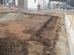 ◇基礎工事に入ります 床掘りからの様子をご紹介します。基礎は建物が完成すると見えない箇所でありながら、建物を支える重要な部分。建売物件でも、注文住宅と同じ施工・管理の上、工事を進めています。
