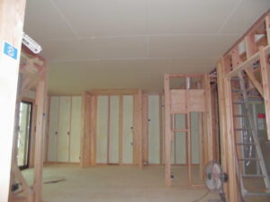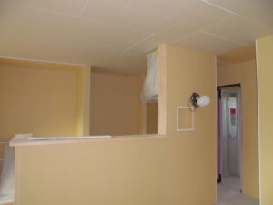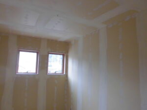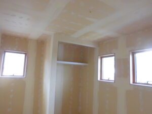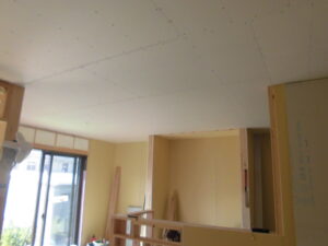 内部状況~つづき クロス施工に入ります(ボード下地へのパテ打ちを行っています)。キッチンも設置済。