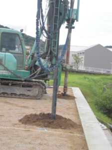 地盤改良工事~地盤調査の結果により、安全な地耐力を確保する為に必要な「改良工事」を要する場合が有ります。今回、安全に長く安心して生活頂く為の改良工事を施しました。
