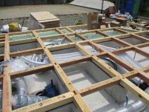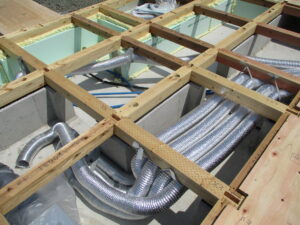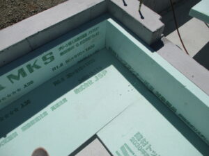 土台敷き~床下へ24時間換気システム「熱交換器本体」「吸排気ダクト」の設置をしています。基礎内に断熱、換気システムは熱交換を行いながら、綺麗な空気を外から取り込み、汚れた空気は外へ捨てるシステムで、全て床下のダクトを経由して循環しています。