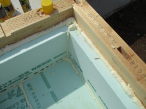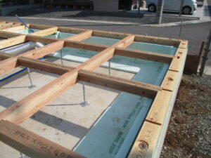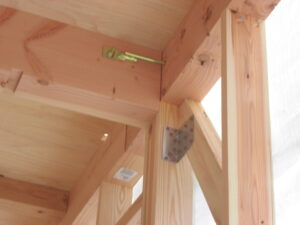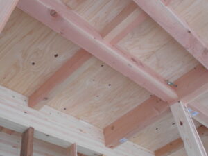 翌日~構造材の接合部分もしっかり施工。外部は構造用面材で外周を覆います。