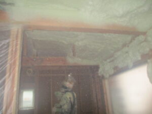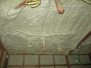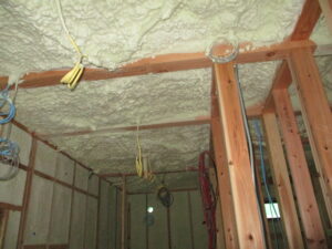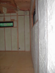 建物内部~吹付断熱施工完了。隙間の無い断熱で、省エネ性も高め・快適に過ごせる空間となります。