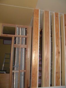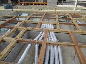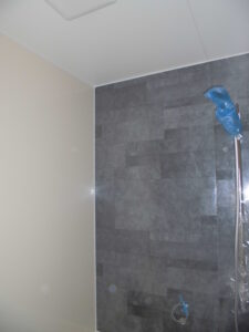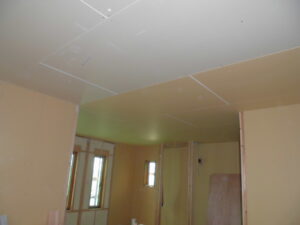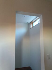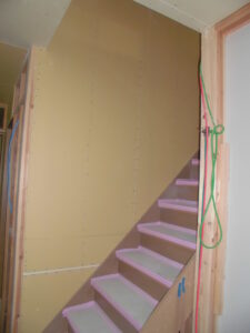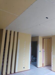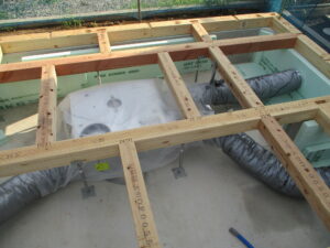 内部の様子~ユニットバス設置済。室内もボード施工が進んで、各部屋のイメージが浮かんできます。画像内に見えるダクトは、24時間換気システムのもの。室内の空気を循環させますが、建物が完成すると隠れて見えなくなります。