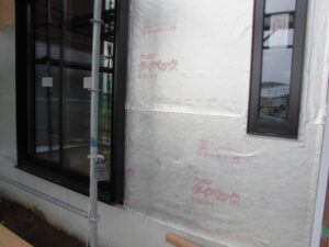 外部~外壁工事前に透湿防水シートで被います。弊社では外部からの熱を反射、内部から熱が逃げるのを防ぐ遮熱タイプのシート「タイベックシルバー」を施工します。夏の暑さ・冬の寒さも軽減し熱ロスも防ぐ優れものです。