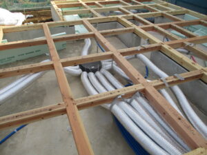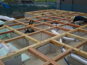 土台敷きを終えた状態~基礎内の断熱施工と24時間換気システム(熱交換型の本体)を基礎内に設置しています。建物内に取り込む空気は専用フィルターを通して綺麗な空気だけ。更に室内への給気時も更に綺麗になった空気が循環し、汚れた空気を排出する際には、熱交換を行う優れもの。室内の温度変化は小さくし、綺麗な空気のみの換気を行う「1種換気」です。